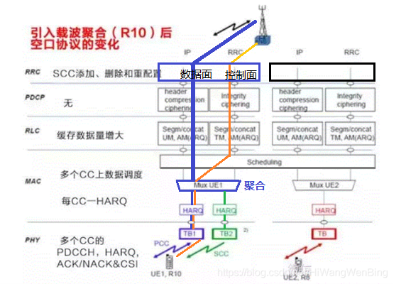 (3)在载波聚合CA的情况下,UE只与primary Cell建立L3 RRC信令面连接,与其他小区没有L3 信令面RRC连接,只有L2的用户面 RLC层连接。