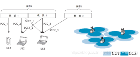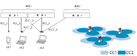 UE2: 驻留在Pcell载波1,并使用SCell载波2,进行载波聚合