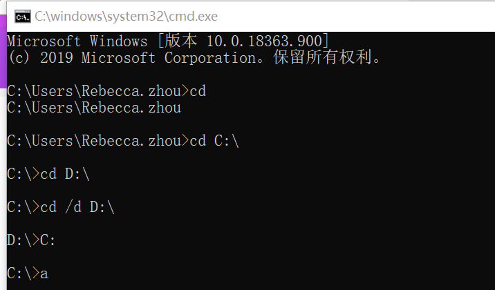 3.如果想要切换盘符,则要输入cd /d 路径;也可以不用cd指令,另一个方法是直接输入盘符:例如C: