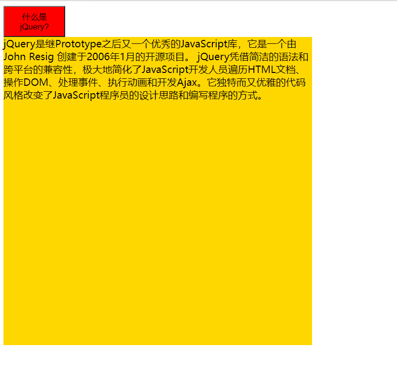 <div id="panel"><button class="head">什么是jQuery?</button><div class="content">jQuery是继Prototype之后又一个优秀的JavaScript库,它是一个由 John Resig 创建于2006年1月的开源项目。jQuery凭借简洁的语法和跨平台的兼容性,极大地简化了JavaScript开发人员遍历HTML文档、操作DOM、处理事件、执行动画和开发Ajax。它独特而又优雅的代码风格改变了JavaScript程序员的设计思路和编写程序的方式。</div></div>
