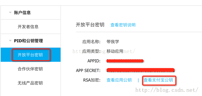 在开放平台密钥栏,可以找到APPID,APP SECRET,和支付宝密钥