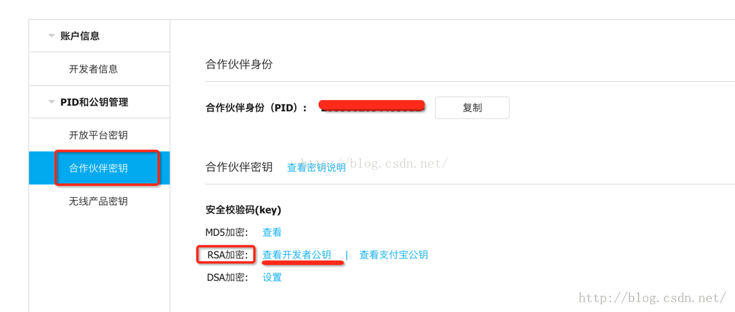 然后到https://openhome.alipay.com/platform/keyManage.htm?keyType=partner(需要登录)中,左侧找到合作伙伴密钥栏,再到右侧的RSA加密中,将公钥粘贴进去。由于,我们已经粘贴进去了,所以这里显示查看开发者公钥,在没填之前写的是“添加开发者公钥”
