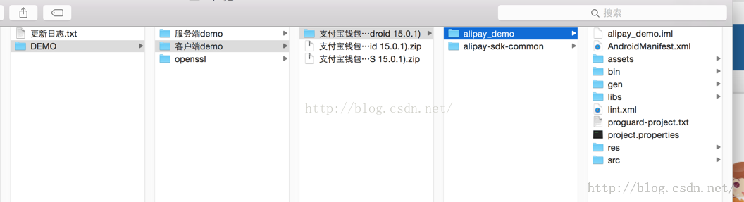 在刚才下载的sdk&demo的源码中,打开DEMO/客户端demo/支付宝Android 15.0.1/alipay_demo工程