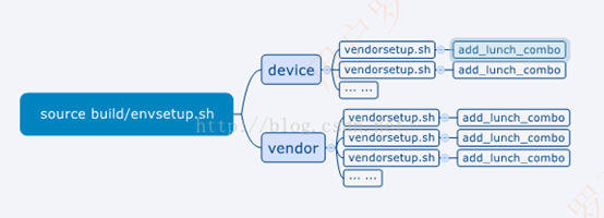 备注:在envsetup.sh里将执行vendor和device目录及各自子目录下所有的vendorsetup.sh,这些vendorsetup.sh做的事情是调用add_lunch_combo将它们各自的产品添加到 LUNCH_MENU_CHOICES 变量里,在lunch时会用到。