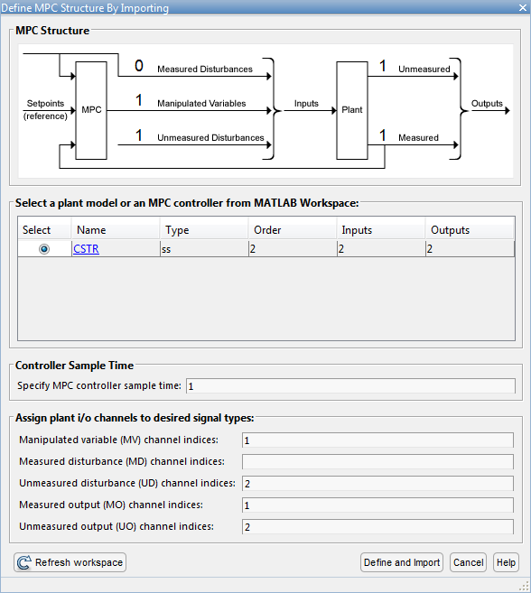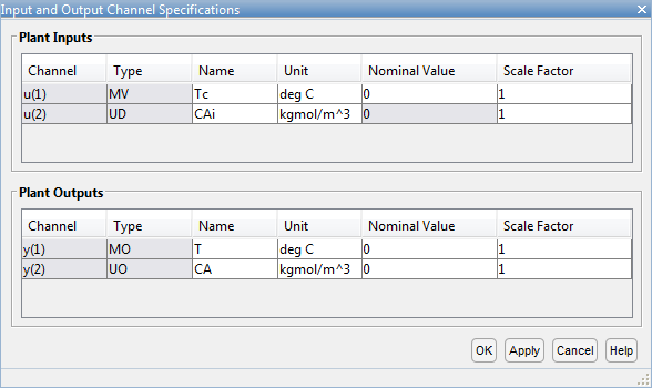默认情况下,所有工厂输入都定义为操作变量,所有工厂输出都定义为测量输出。在 Assign plant i/o channels 部分,指定输入和输出通道指数,例如: