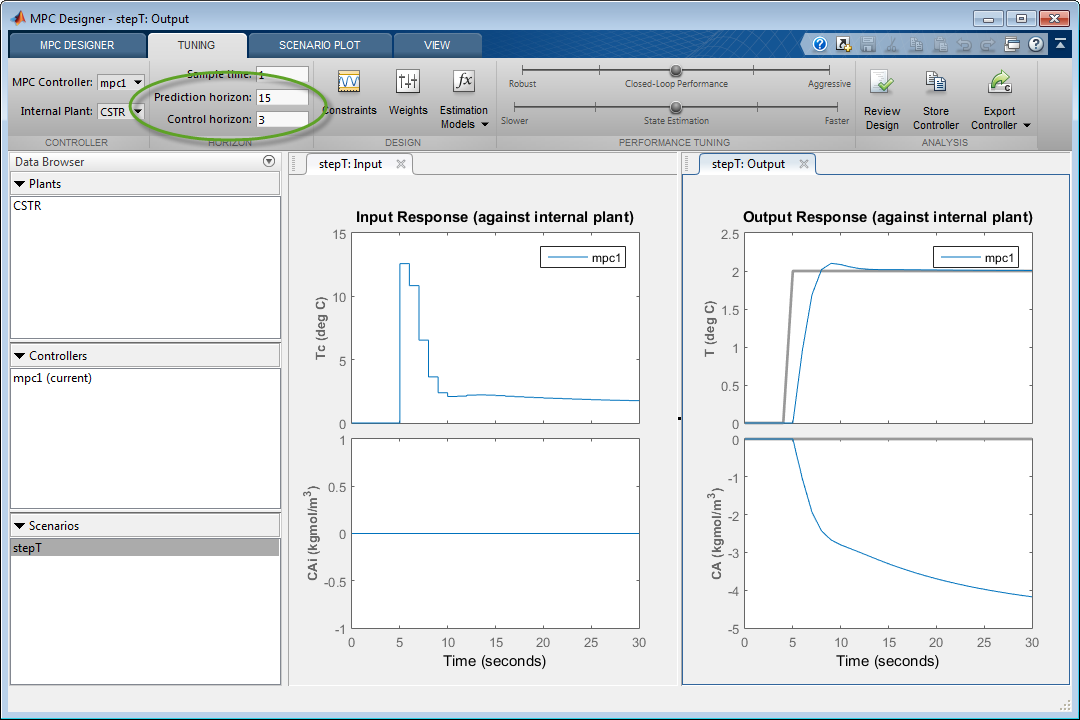 在 Tuning 选项卡的 Horizon 部分中,指定预测层 Prediction horizon 为15,控制层 Control horizon 为3。