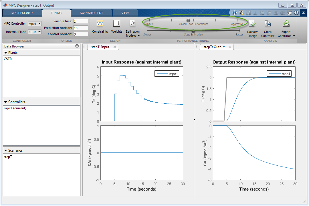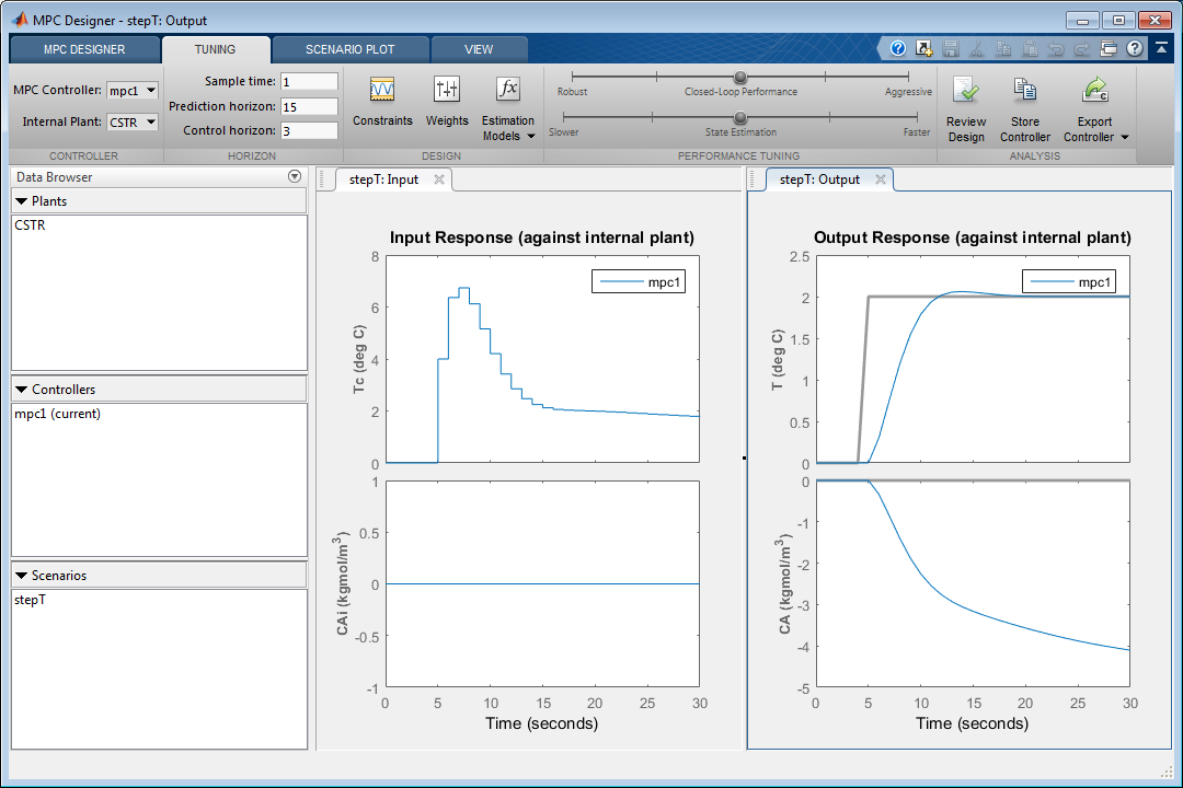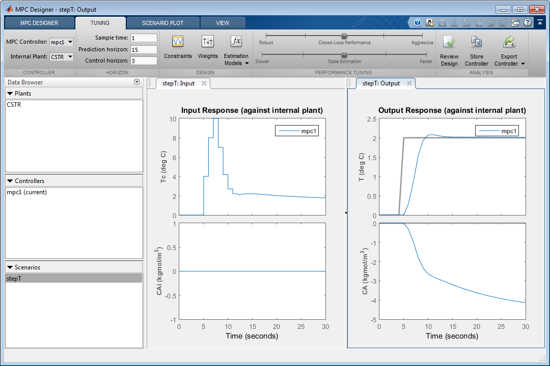 在 Tuning 选项卡的 Analysis 部分,单击 Export Controller 将调优后的控制器mpc1保存到MATLAB工作区。