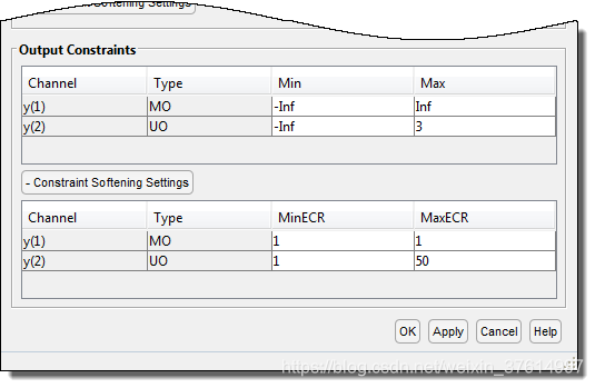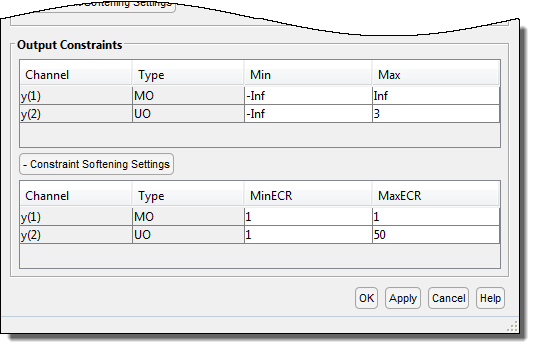 默认情况下,所有输出约束都是软约束,这意味着它们的MinECR和MaxECR值都大于零。为了进一步软化未测量输出(UO)约束,增加其MaxECR值。
