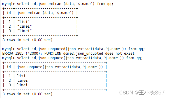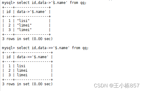 select id,json_unquote(json_extract(data,'$.name')) from qq;