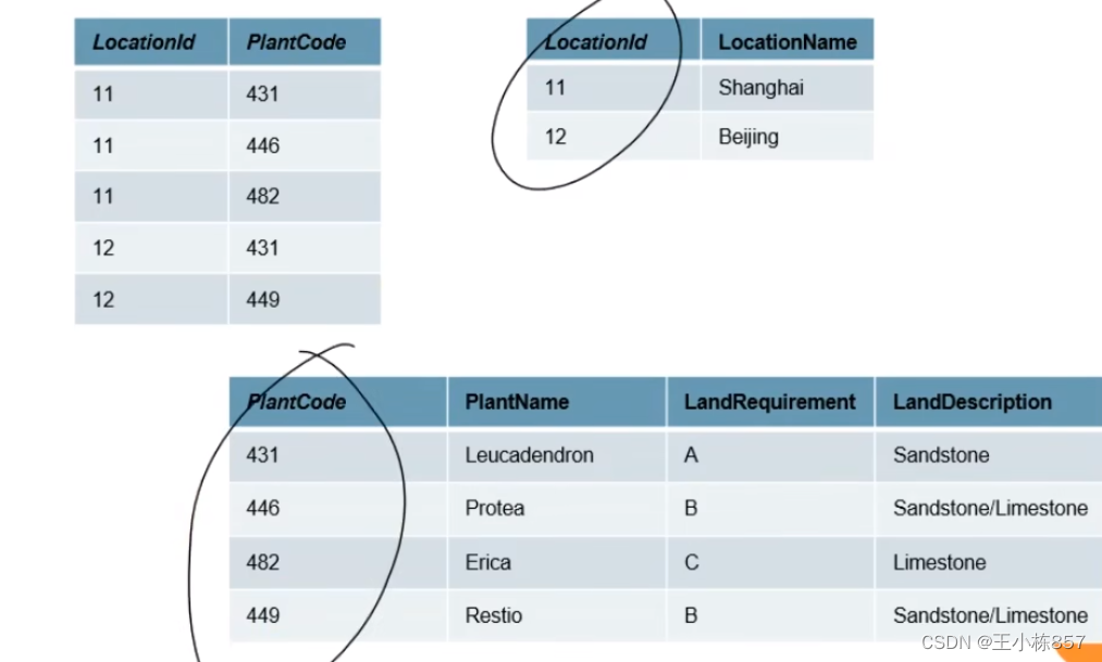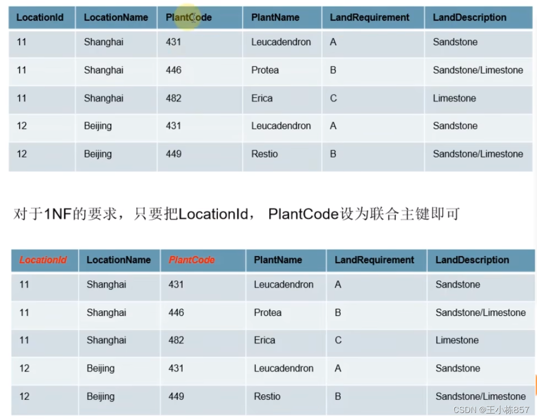 遵循3NF,发现LandDescription依赖与LandRequirement,LandRequirement依赖于Plantcode,这属于传递依赖,对其表进行拆分