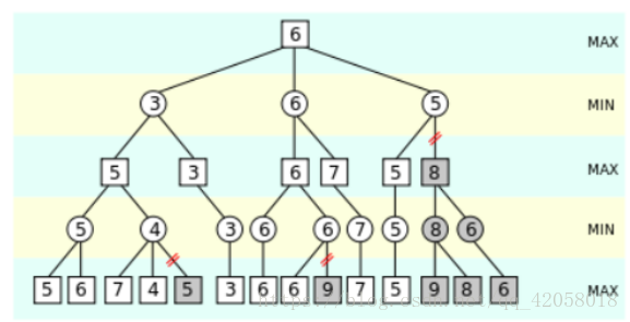 α,β剪枝算法是一种基于深度优先搜索的剪枝算法,示例如下图所示:
