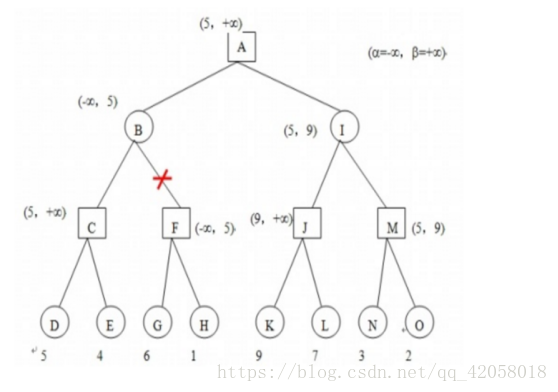 假设博弈树的搜索结果如图,正方形为MIN决策层,圆圈为MAX决策层。搜索结果D、E的评分分别为5和4,根据MAX决策准则,如果极小决策者选择C,那么对手势必会选择D,所以C方案所带给极小决策者的得分是5(记为α)。在搜索F方案的过程中,我们发现下一步极大决策者存在得分为6的方案G,所以F方案带给极小决策者的得分必然大于等于6,这个得分大于已经搜索完毕的方案C,所以对于极小决策者来说F方案已经不可能优于C方案,故不再需要计算F的其他子节点情况,剪去F分枝。