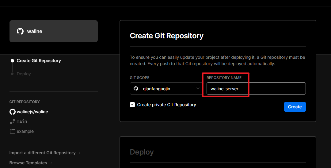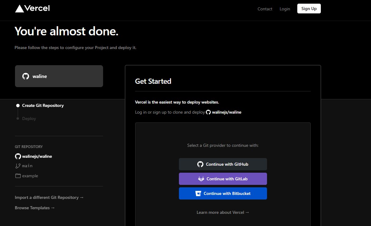 由上面的表格可以看到,Waline 支持多种服务端,为了最简便上手,我们使用第一种方式,即在 Vercl 上安装服务端。首先,点击下面的按钮,一键部署: