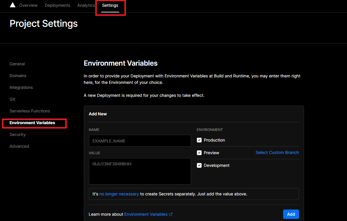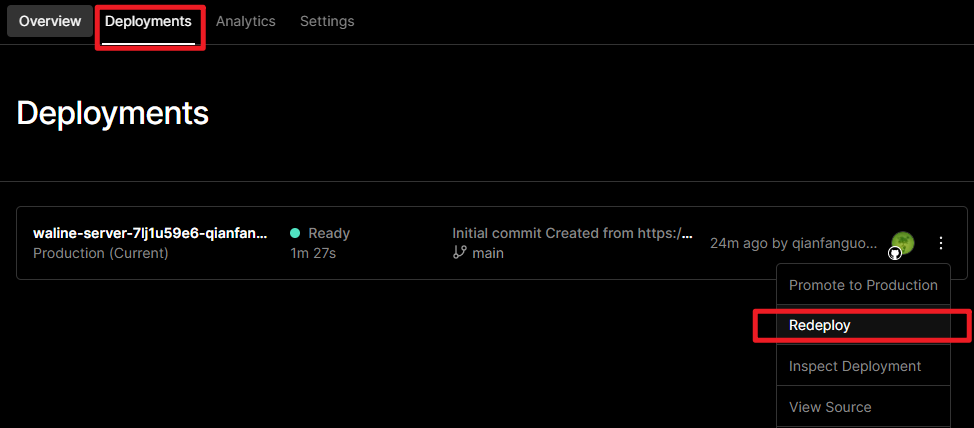为了使环境变量生效,我们需要重新构建一次。在上方找到 Deployments ,选择第一个右边的三个点,点击 Redeploy 。