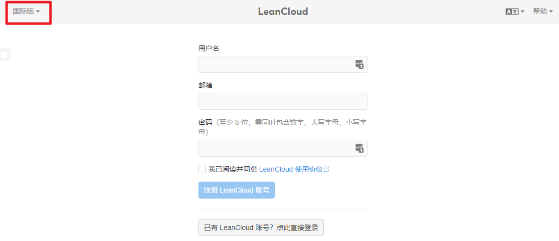 我们需要注册一个 Leancloud 国际版 的账号,注意,一定要是 国际版,国内版需要绑定备案的域名,比较麻烦。具体可以在注册时的左上角看到: