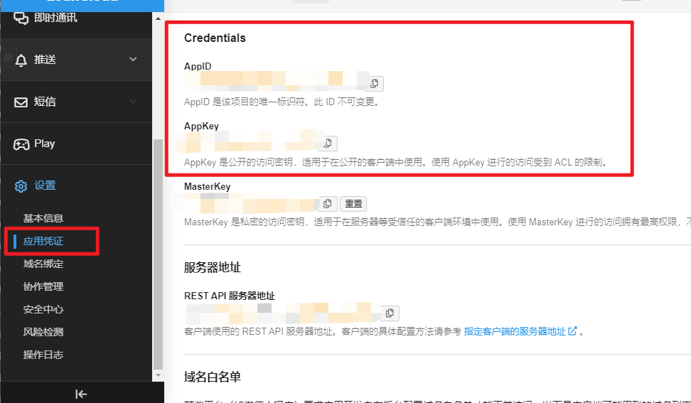 点击应用凭证,取得我们 AppKey 、App id 、以及 MasterKey :