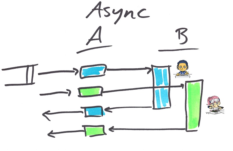 想象一个服务 A 正在与服务 B 交互的场景。如果 A 被锁定到 B 回复后才能继续进行其他操作,则 A 是同步的。此时 A 所在的线程是空闲的,它不能为其他的请求提供服务。线程会变得非常笨重-切换线程是低效的,因为这需要耗费可观的内存,如果你进行了大量这样的操作,操作系统会因此陷入困境。这样做的结果就是白白浪费了资源,降低了生产力,增加了等待时间(因为请求都在队列中等待服务)。