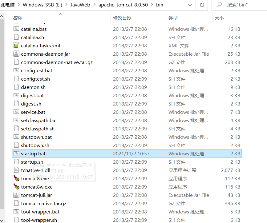方法一:找到Tomcat目录下的bin目录下的 startup.bat 文件双击,即可启动