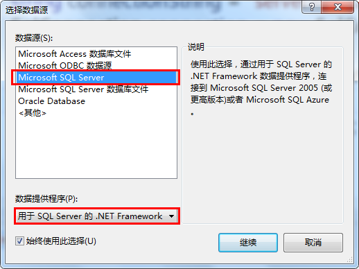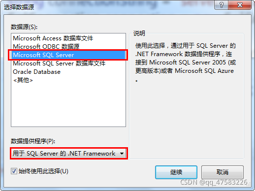 2、我们是要连接到sql数据库,所以我们数据源选择的是红框内的Microsoft SQL Server(下面那个需要通过数据库文件来连接),数据提供程序我们选择:用于SQL Server的.NET Framework