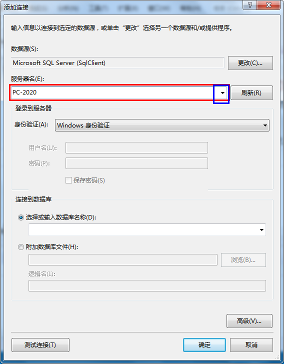 3、服务器名可以选择自己输入也可以选择右边蓝色的小框中的小三角来选择。