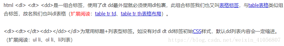首先dt和dd是放于dl标签内,标签dt与dd处于dl下相同级。也就是dt不能放入dd内,dd不能放入dt内。在dl下,dt与dd处于同级标签。DD标签可以若干。同时不能不加dl地单独使用dt标签或dd标签。