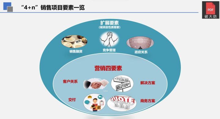 在销售项目运作中,我们通过营销要素“4+n”分析,来制定项目策略。“4”即:客户关系、解决方案、交付、商务方案。“n”即扩展要素,包括:销售融资、竞争管理、政fu关系等。