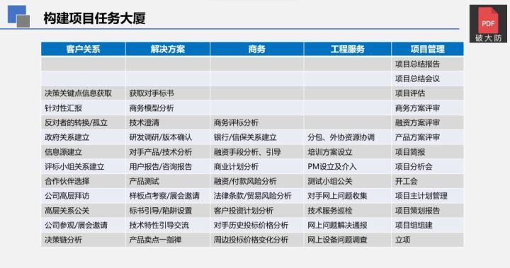 那么,项目计划首先要构建任务大厦,任务打啥有几个维度:客户关系、解决方案、商务、服务、项目管理这几个维度;其次要有明确的进度监控,因为在漫长的拓展过程中监控尤为重要。