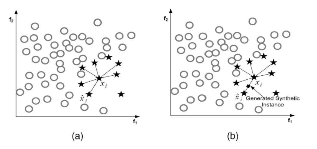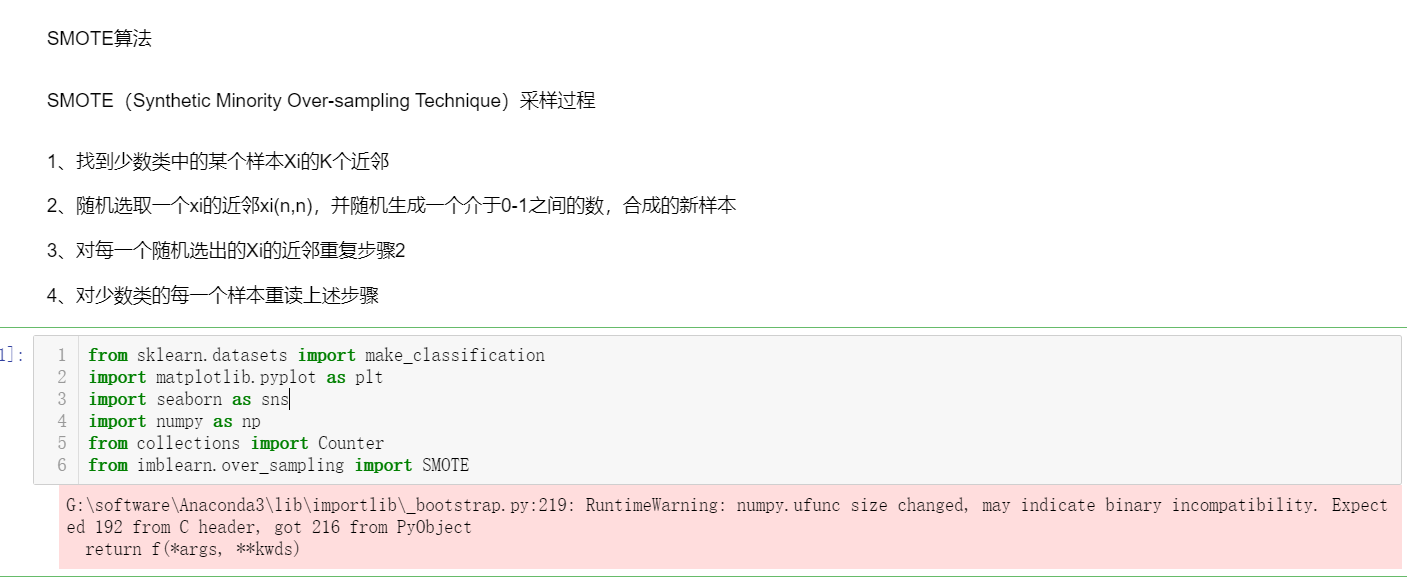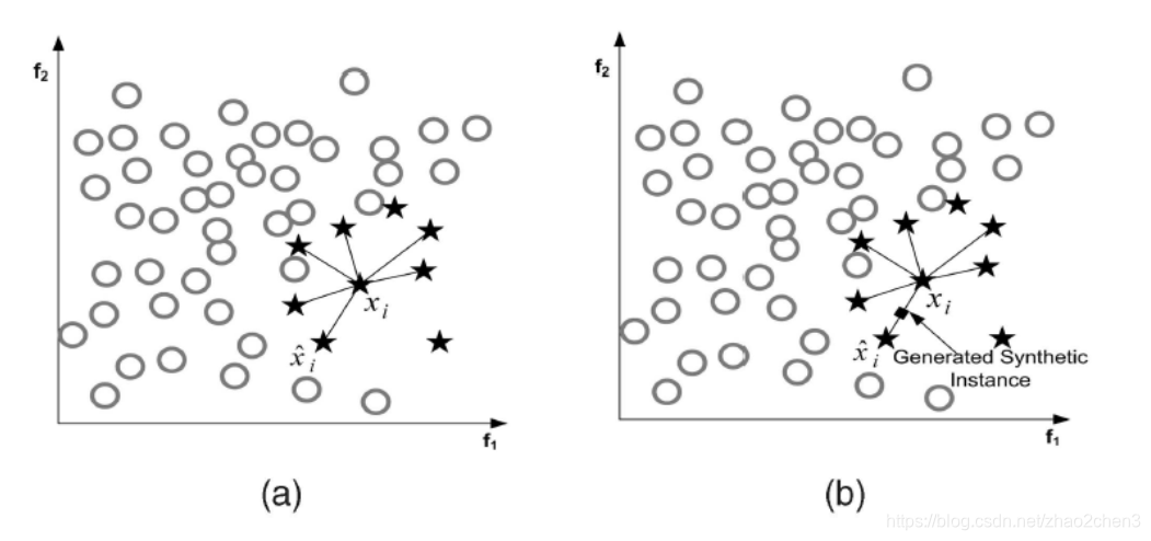 SMOTE算法的思想是合成新的少数类样本,合成的策略是对每个少数类样本a,从它的最近邻中随机选一个样本b,然后在a、b之间的连线上随机选一点作为新合成的少数类样本。