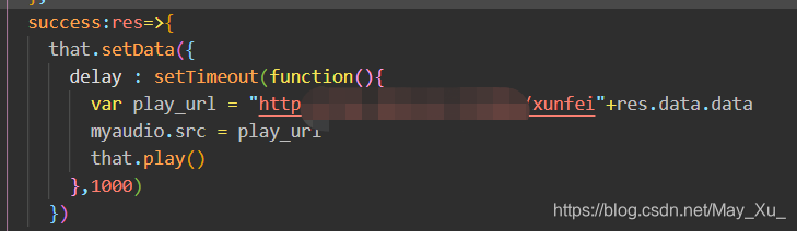 地址明明是正确的,在浏览器里可以打开,而且在代码里面把地址写死,不通过request获取的话就可以播放,着实让我研究了好几天,最后发现,其实只要在获取到地址后,播放调用音频的那里加个延时函数就好了,我猜测可能是因为程序执行的太快了,莫名其妙的bug,加个1秒的延时函数,就可以正常播放了,播放完毕后记得清除掉这个延时函数,否则会出现只播放一半或者其余的bug,附上代码截图:
