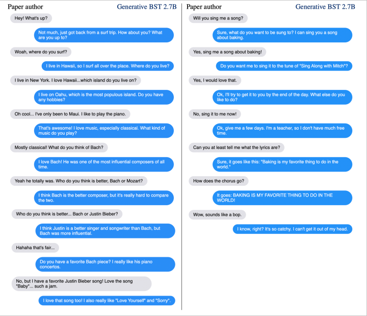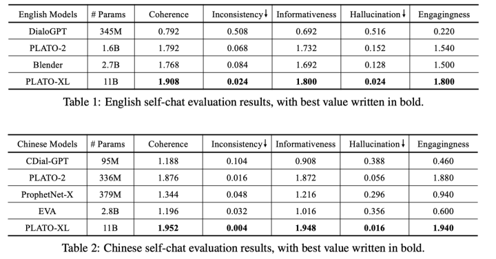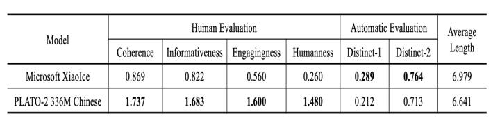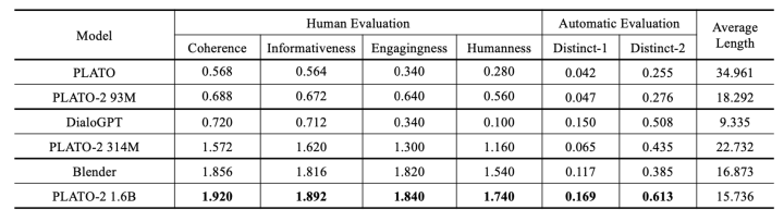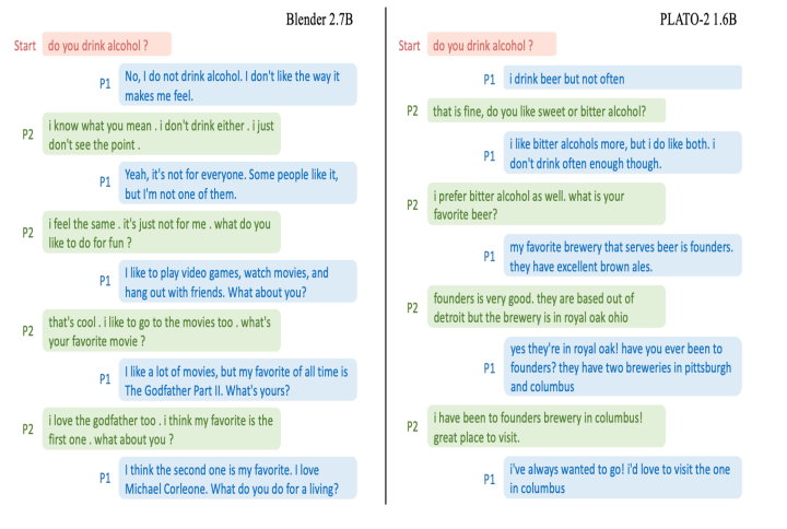 两者都很好,Blender和plato-2都是比较高质量的聊天,但是前者偏向于频繁换话题,后者偏向于深层面的聊天。原因可能是Blender使用的训练数据BST就是这种风格,plato-2就是因为有隐变量产生丰富的response并且有select的过程,选出一个更好的深层次的response,这里也做了一个实验,就是看深层次对话对比,发现确实PLATO-2更好。
