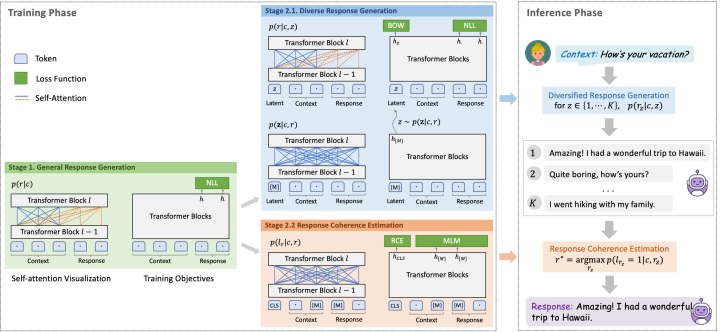总的来说相比于PLATO,PLATO-2 在框架上基本上没有太多改动,主要就是使用了一种多阶段训练方式扩大了数据量和模型参数量。