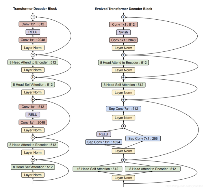 Meena采用的是19年Google通过NAS方法得到的进化版transformer模型Evolved Transformer如下。Meena由1个ET编码器和13个ET解码器构成,ET解码器和标准Transformer解码器的对比如下图所示: