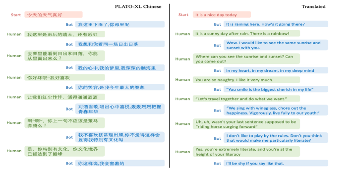作为开胃菜,本次主要介绍一下开放领域end-to-end的一些耳熟能详的模型,说白了就是近两年火过的模型,尤其提一嘴的是目前在中文领域,百度的PLATO应该是效果最好的了,大家可以试玩一下。这里展示一下笔者实验过的一个聊天片段: