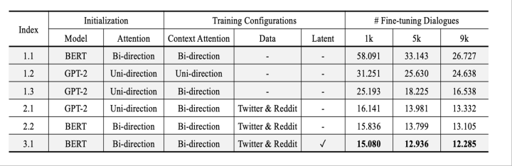 1系列是直接finetune;2系列是先在Reddit and Twitter数据集上面预训练一把;3是使用了latent