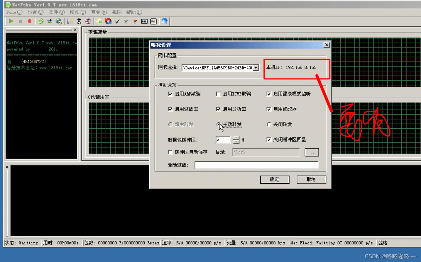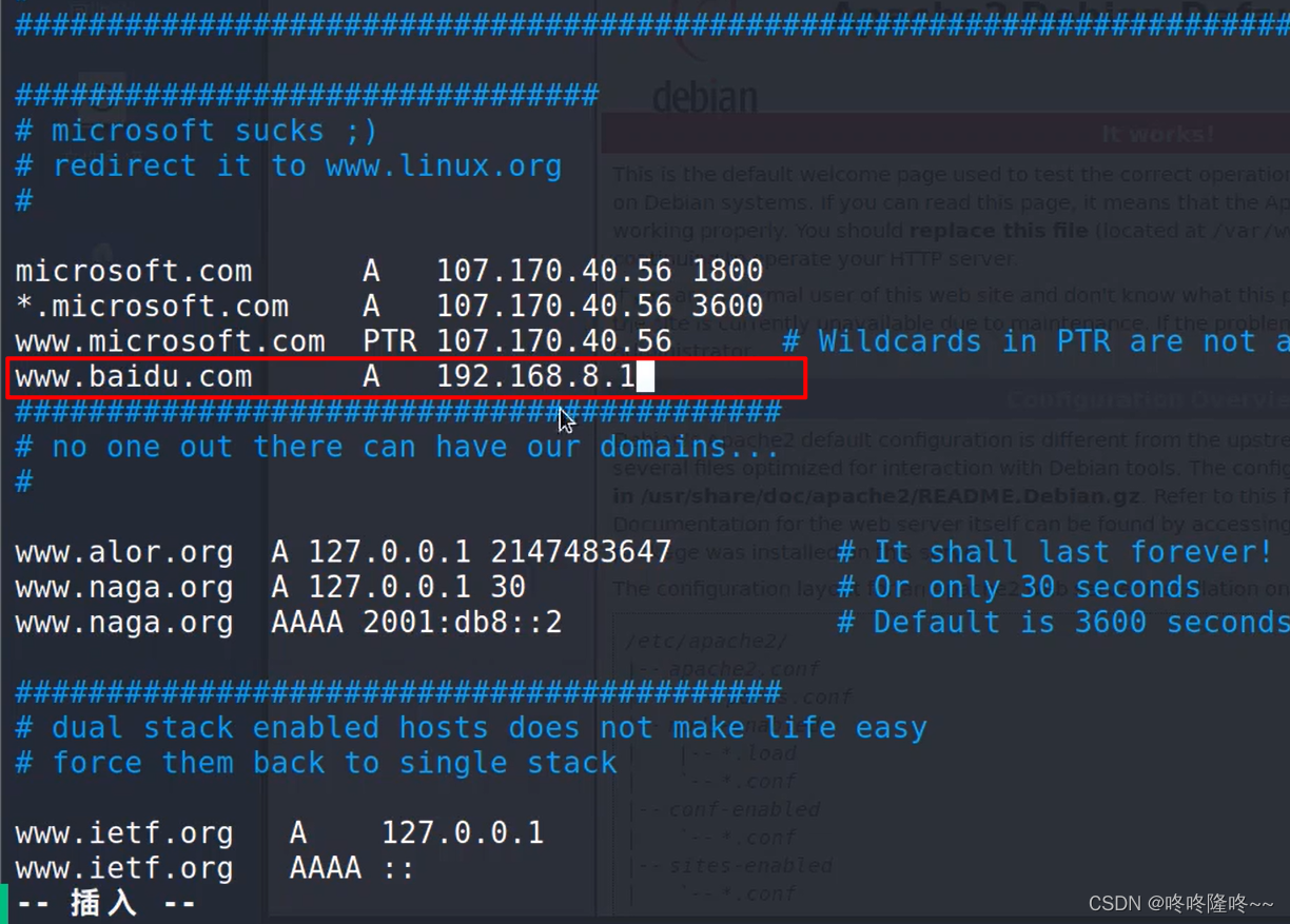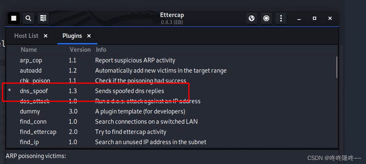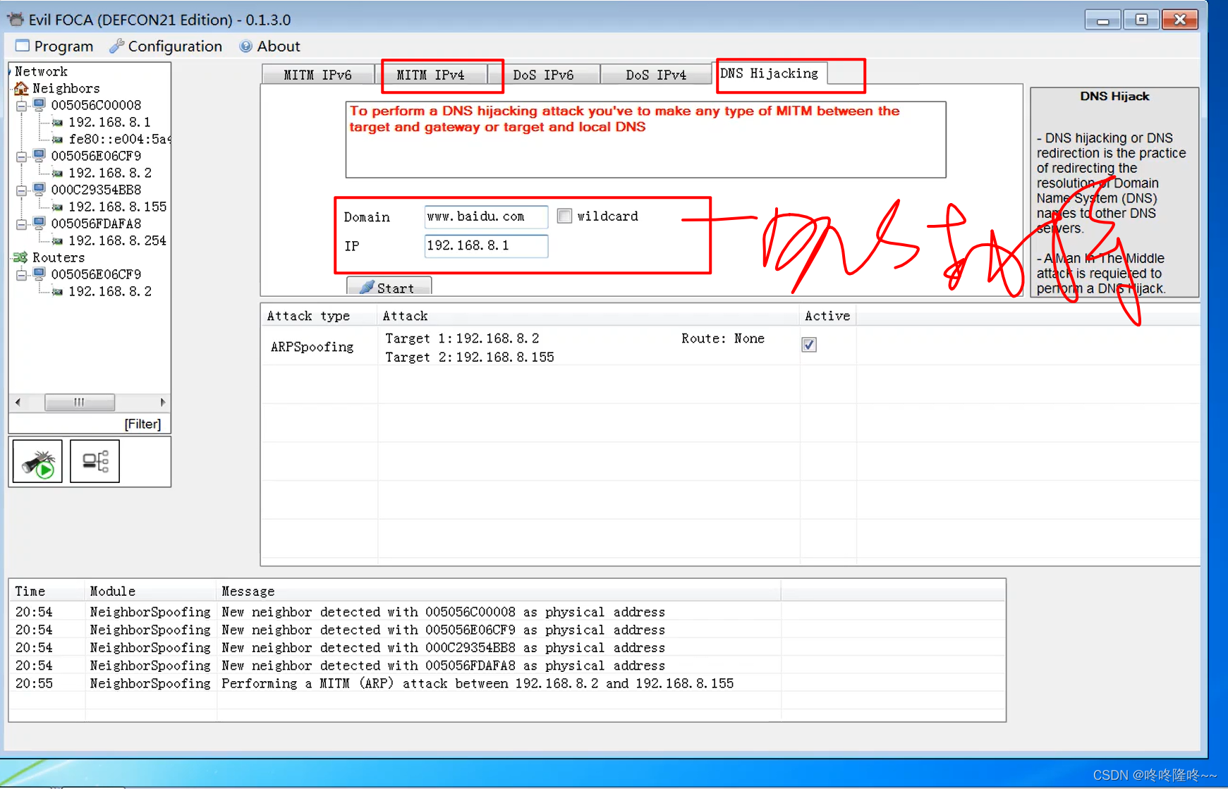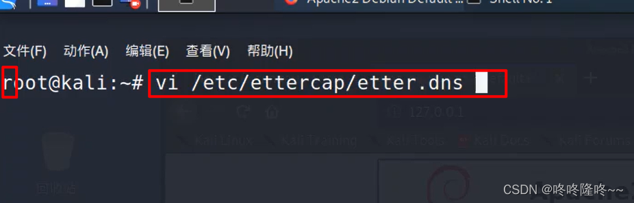 在其中运行dns欺骗。首先要运行红框内的命令,配置