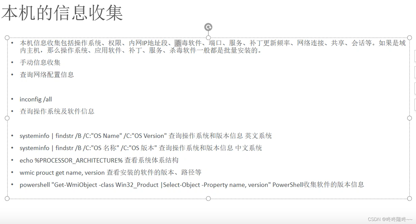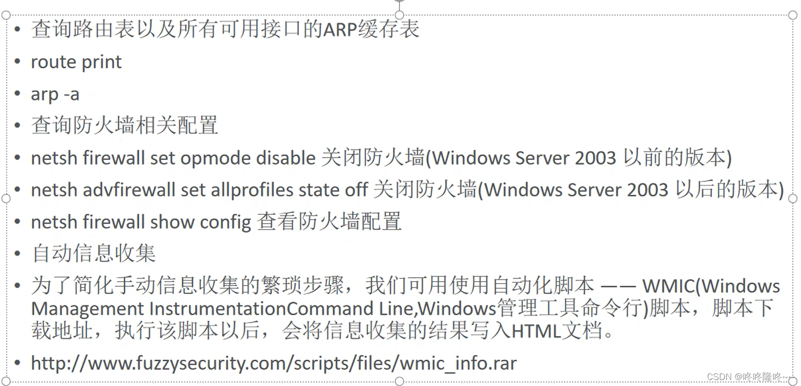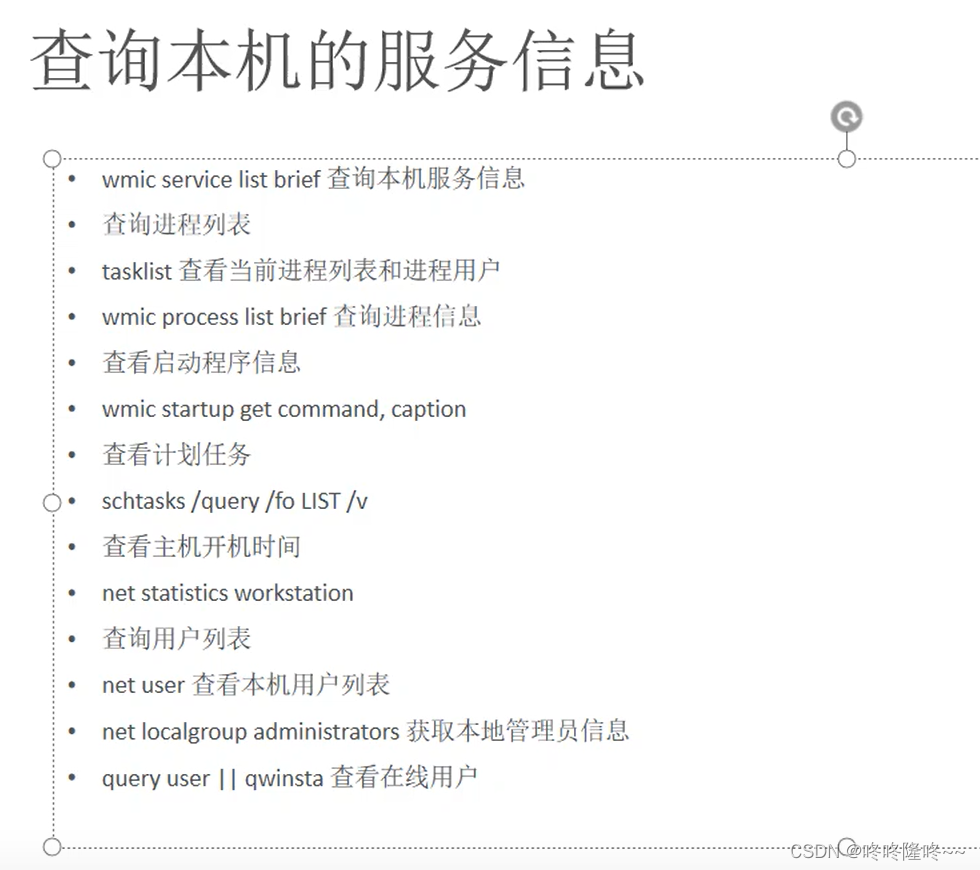 看进程 tasklist 看端口netstat -an 看网络链接 netstat -ano Linux中为tnlp、unlp 看补丁 systeminfo(可看都系统版本类型等) 查看开了那些共享 net share 查看计划认为 at