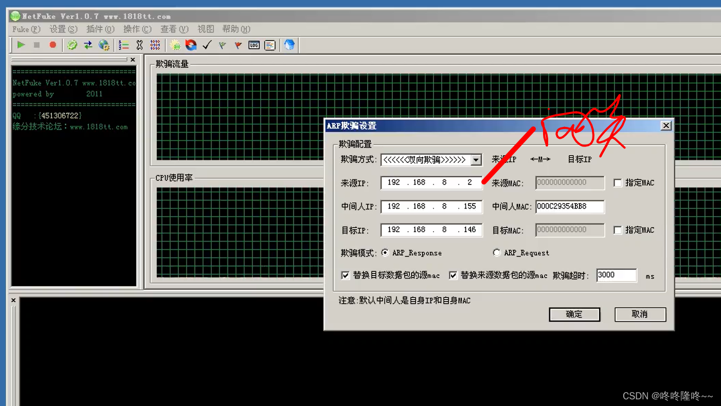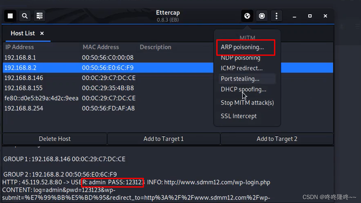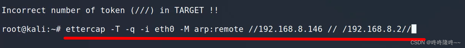 -T是保持静默,-q -i指定你要欺骗的网卡,-M中间人欺骗方式 ,192.168.8.2为网卡