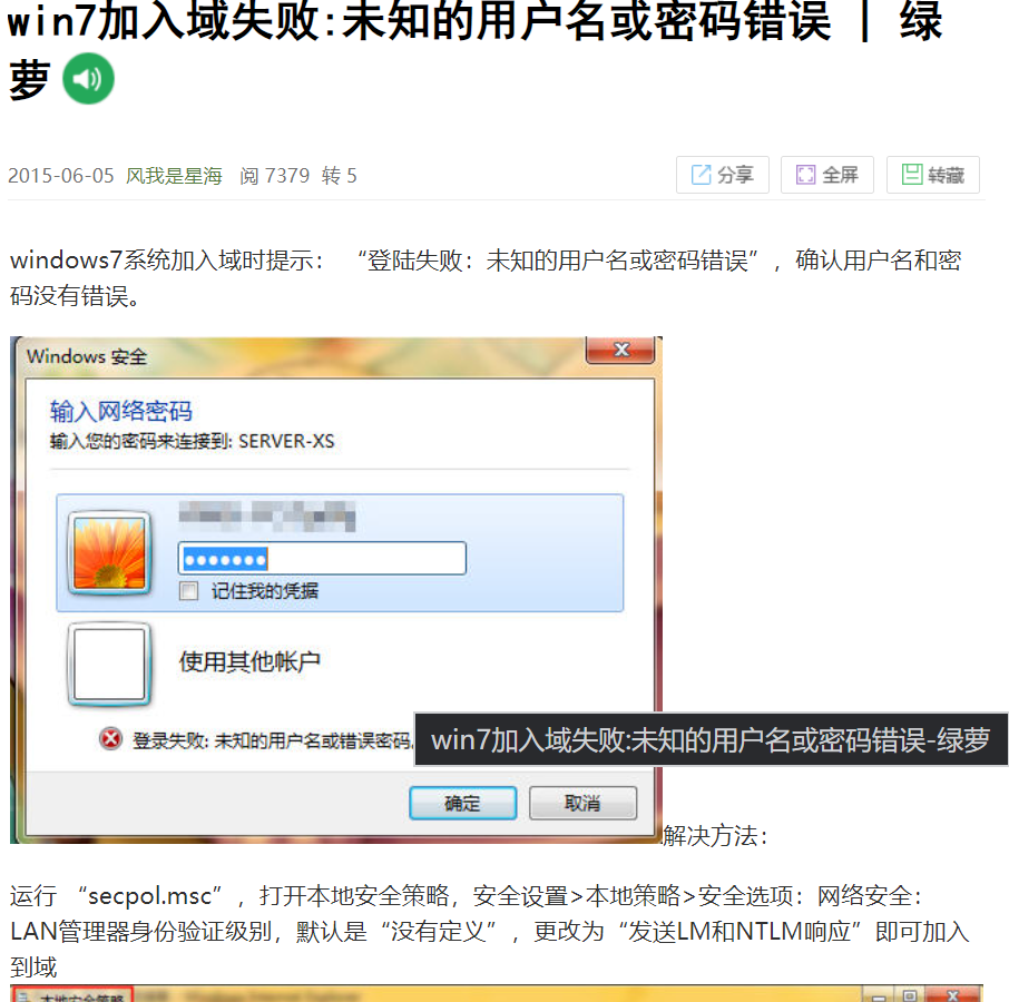 上图是因为出现了一个问题,就是win7加入域后再重新启动,怎么输入账号密码(在输入正确的前提下)都提示有错误,弄了半小时。后来幸好之前有快照,登进去之后改了下复杂点的密码。