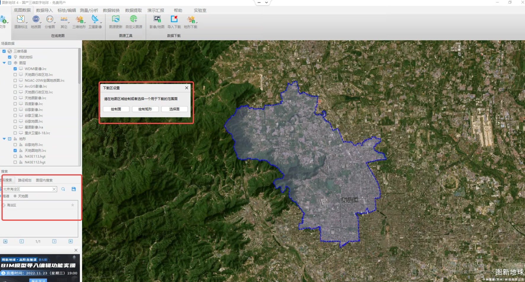 5、 选择底图数据->影像\地图,首先选定一片区域,可以手动绘制,也可以左侧高德搜索行政区划之类的