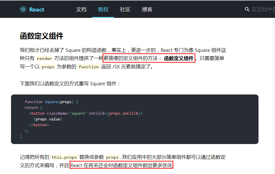 参考react官网中文教程里面的:函数定义组件