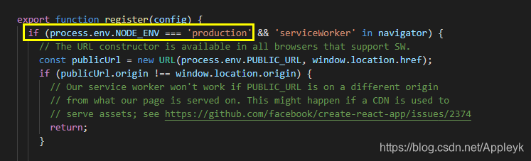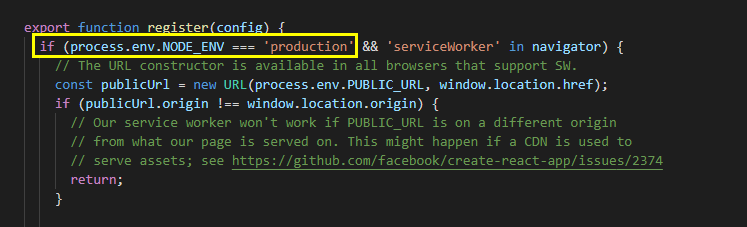 service worker是在后台运行的一个线程,可以用来处理离线缓存、消息推送、后台自动更新等任务。registerServiceWorker就是为react项目注册了一个service worker,用来做资源的缓存,这样你下次访问时,就可以更快的获取资源。而且因为资源被缓存,所以即使在离线的情况下也可以访问应用(此时使用的资源是之前缓存的资源)。注意,registerServiceWorker注册的service worker 只在生产环境中生效(process.env.NODE_ENV === ‘production’)