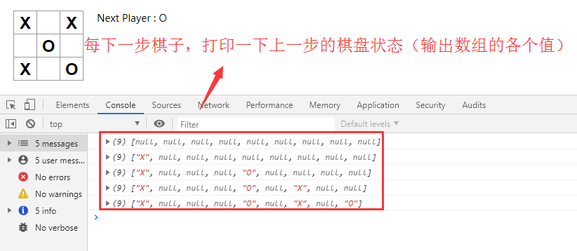 (1)跟着官网建议,按着教程提示,手敲了一遍代码,最终只实现了简单的棋子交替下和输赢判断,历史状态什么的没有实现