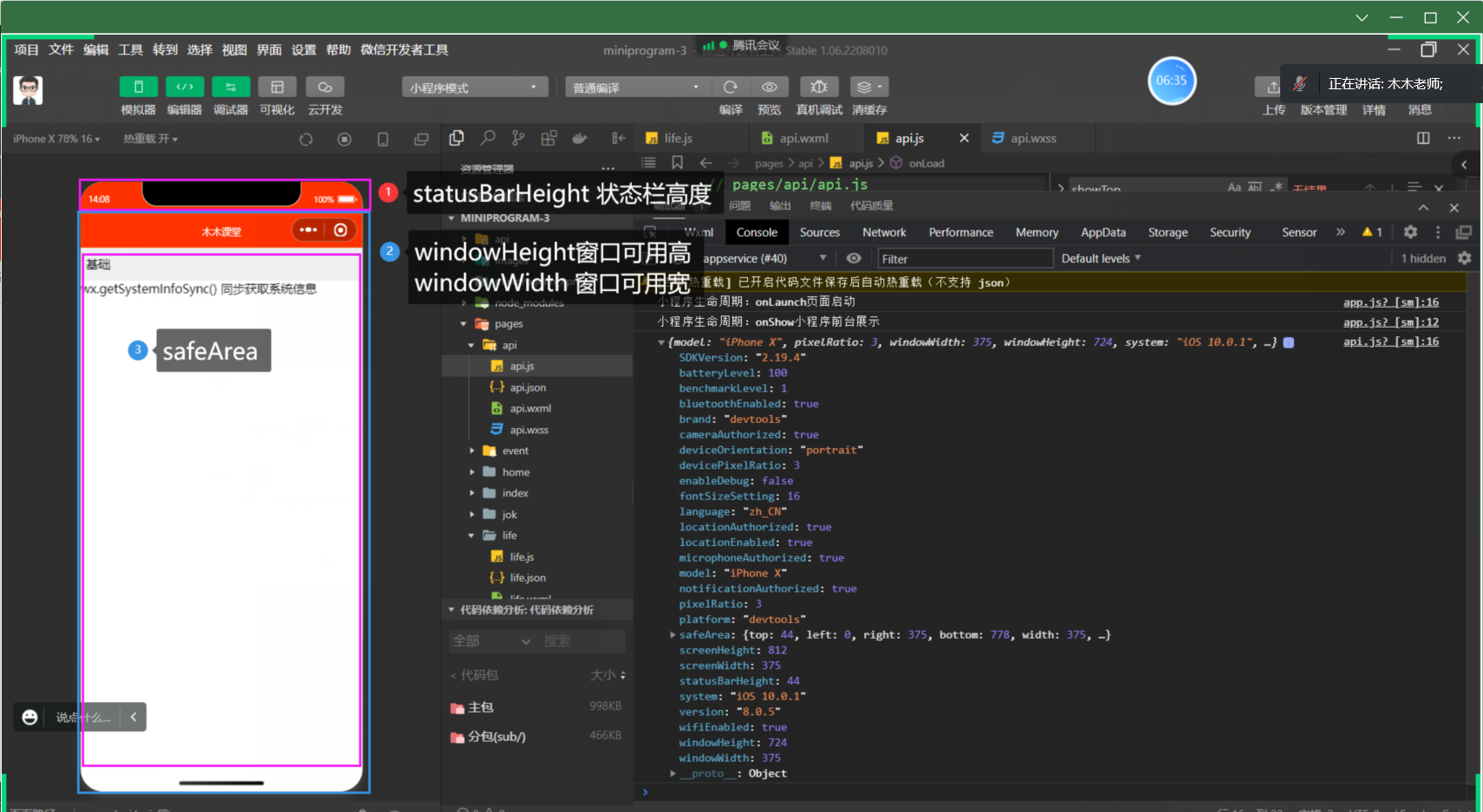 wx.getSystemInfoAsync()同步获取系统信息,一般常用到的系统信息有statusBarHeight状态栏高度、windowWith/Height可用窗口的宽/高、safeArea安全区域、model手机型号、system系统 iOS/Android、batteryLevel电量等。