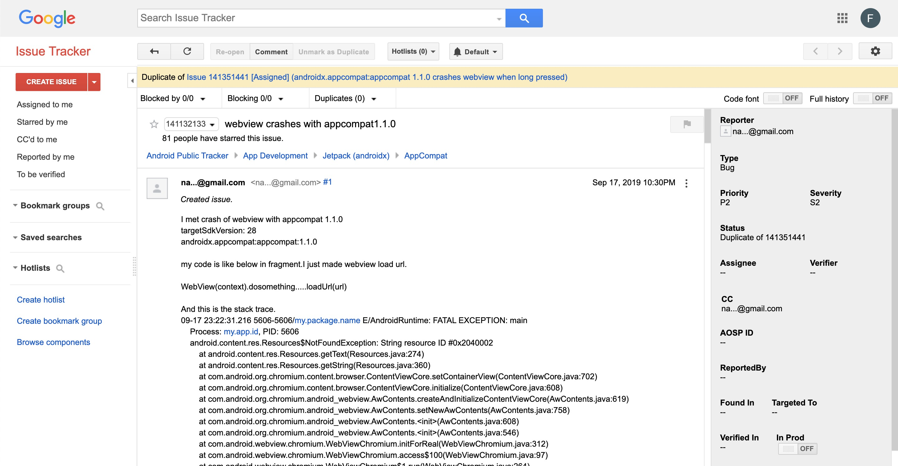 拿到错误栈就好说了,无脑 Google 一下,很多人都遇到了这个问题,issue tracker 上有人已经提交了这个 bug。
