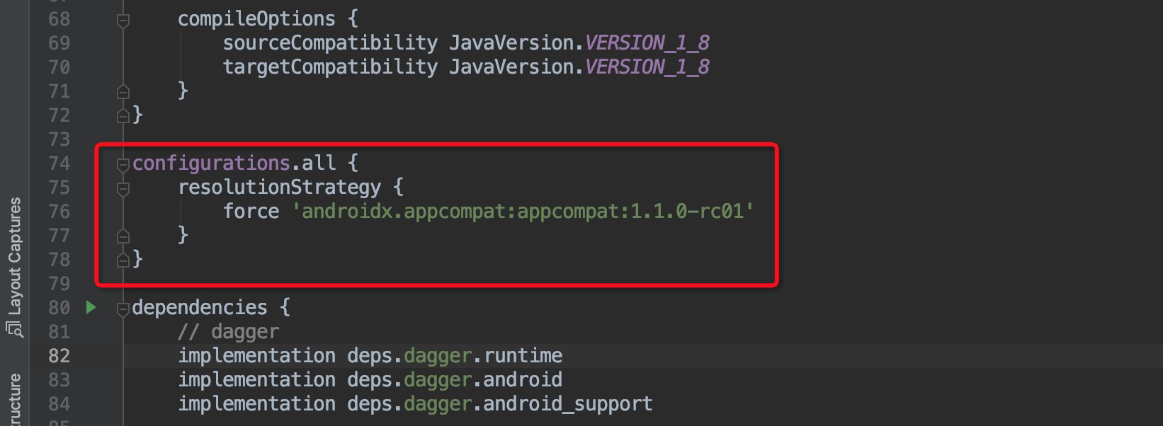 configurations.all {resolutionStrategy {force 'androidx.appcompat:appcompat:1.1.0-rc01'}