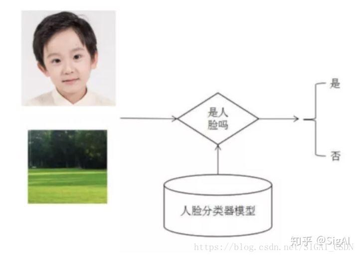 经典的人脸检测算法流程是这样的:用大量的人脸和非人脸样本图像进行训练,得到一个解决2类分类问题的分类器,也称为人脸检测模板。这个分类器接受固定大小的输入图片,判断这个输入图片是否为人脸,即解决是和否的问题。人脸二分类器的原理如下图所示: