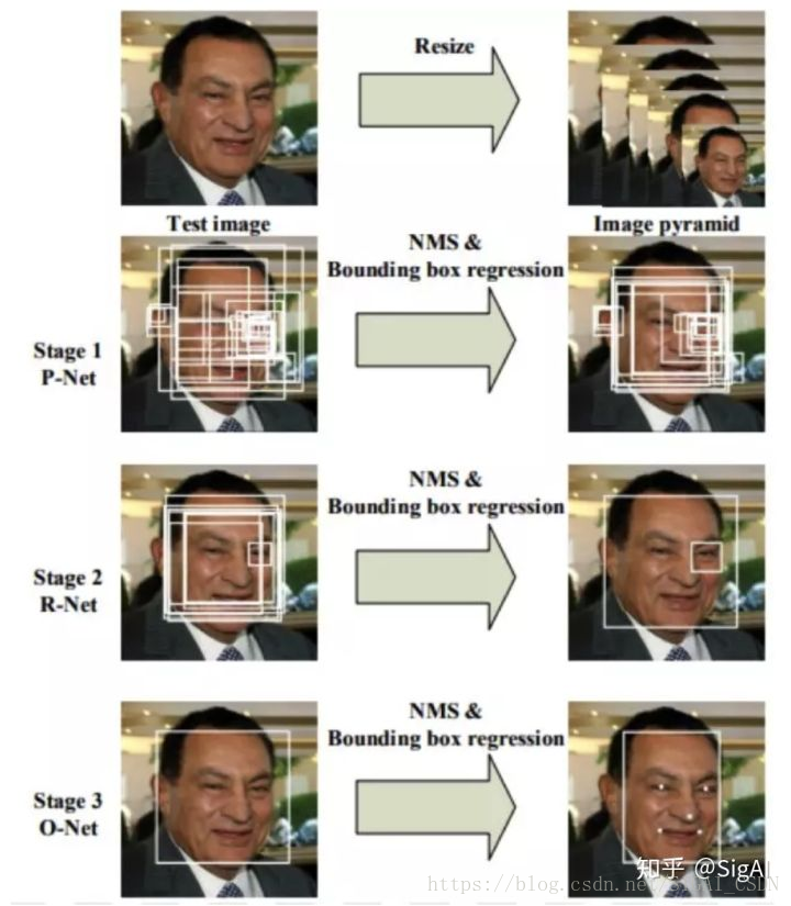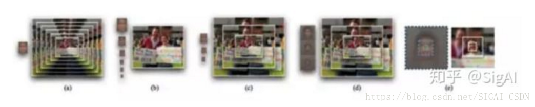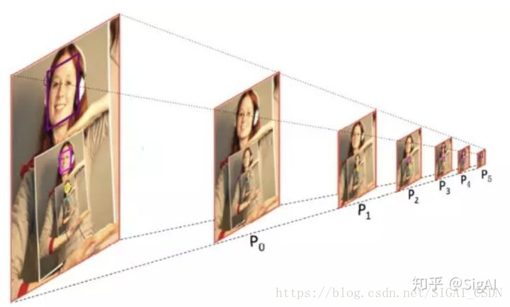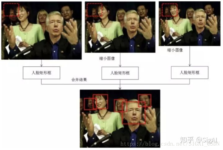 由于一个人脸附件可能会检测出多个候选位置框,还需要将检测结果进行合并去重,这称为非极大值抑制(NMS)。多尺度滑动窗口技术的原理如下图所示: