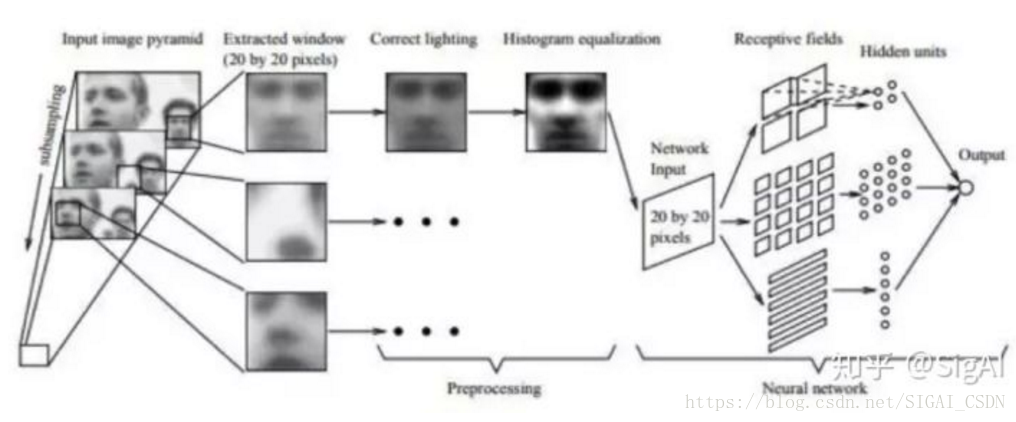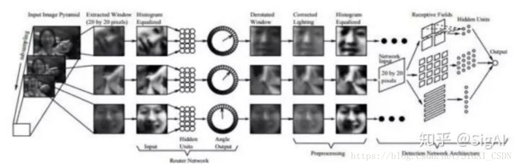 早期有代表性的成果是Rowley等人提出的方法[1][2]。他们用神经网络进行人脸检测,用20x20的人脸和非人脸图像训练了一个多层感知器模型。文献[1]的方法用于解决近似正面的人脸检测问题,原理如下图所示: