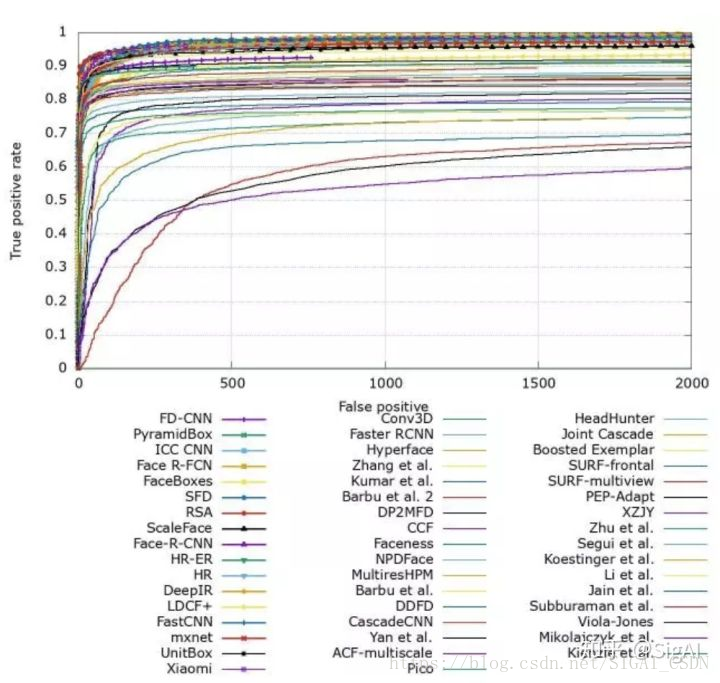 接下来介绍AdaBoost框架之后的方法,boost算法是基于PAC学习理论(probably approximately correct)而建立的一套集成学习算法(ensemble learning)。其根本思想在于通过多个简单的弱分类器,构建出准确率很高的强分类器,PAC学习理论证实了这一方法的可行性,感谢大神Leslie-Valiant!!我们首先来看FDDB上各种检测算法的ROC曲线,接下来的介绍将按照这些ROC曲线上的算法进行展开。