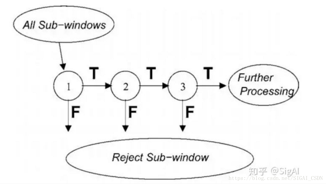 用级联AdaBoost分类器进行目标检测的思想是:用多个AdaBoost分类器合作完成对候选框的分类,这些分类器组成一个流水线,对滑动窗口中的候选框图像进行判定,确定它是人脸还是非人脸。